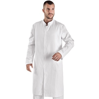 Машки работен мантил во бела боја, по ХАСАП стандард. Закопчување со чичак лента, изработени од квалитетен памук (100% памук, 200 г/м2) којшто е паропропустлив и лесен за одржување - може да се пере на високи температури и лесно се пегла. Погоден за употреба во прехранбената индустрија, фармацевтската индустрија, медицината, во кујни, аптеки и сл.